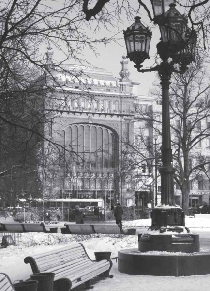 Главный фасад выделен огромной аркой с витражом, выше размещался ленточный балкон, ныне утраченный. На фасаде, облицованном гранитом, установлены отлитые из чугуна скульптурные группы аллегорических фигур Промышленности и Торговли, Искусства и Науки, выполненные Амандусом Хейнрихом Адамсоном.