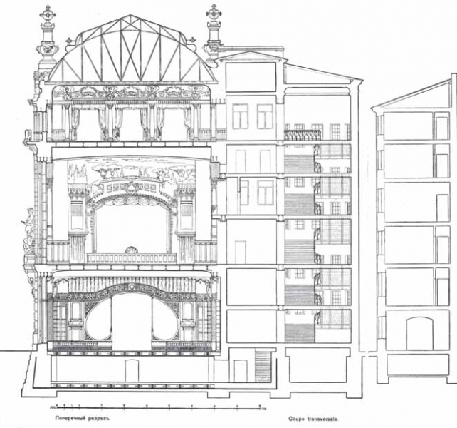 Вот как описывает театральный зал В. А. Вакулин: «Театральный залъ — въ два просвѣета, отдѣлан богато. Преобладают свѣтло-желтые тона. Мебель — массивная, бѣлаго цвѣта — обита зеленым плюшем. Стѣна противъ сцены сплошное венеціанское окно. Въ правой (отъ сцены) стѣне еще три венеціанских окна, поменьше размѣром, но все же очень большихъ. Окна разукрашены разноцвѣтными стеклами, сквозь которыя, ложась причудливыми узорами на стѣнах и мебели, пробиваются с Невскаго лучи электрическаго свѣта».