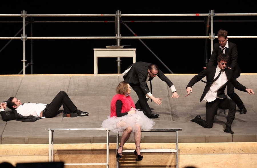 — Совершенно верно. «Грозу» я делал гораздо дольше, чем предыдущие спектакли, гораздо осторожней — было даже несколько выпускных периодов. До этого казалось, что важнее скорее выпустить спектакль, пусть даже не совсем доделанный. Как, например, это было со «Что делать», который я рискнул выпустить совсем сырым, что создало этому спектаклю репутацию чуть ли не провала, но потом он вырос и выровнялся. На его основе, кстати, думаю сделать фильм. «Что делать» был для меня очень важным зачином программы — это заложено в самом названии спектакля, в его эстетике, даже в зрительском амфитеатре, который был поставлен в зале. И в том художественном качестве, в котором хотелось видеть спектакль (в самом начале, конечно, этого еще не было, но сегодня есть). То есть, выпуская недоделанный спектакль, я понимал риск, но для меня движение вперед, даже под градом критических камней, было важнее.
