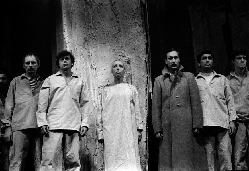 — Да, это был действительно великолепный спектакль, как ни странно. Он был поставлен от отчаяния. Мой первый директор, Экимян, сказал, что дело совсем плохо, что почти решен вопрос о моем увольнении. (Меня несколько раз принимались увольнять, но как-то что-то отвлекало и руки не доходили, какой-то ангел-хранитель меня уберегал.) У меня дома на полке стоит собрание сочинений советских драматургов и я периодически эти тома просматривал. Но ничего, кроме ужаса графоманского, там не находил. А вот в «Оптимистической трагедии» есть все же печать таланта. Если отбросить то, что режет ухо (и мы это сделали в спектакле), то возникает конструкция, в которой есть что-то талантливое. Сама тема, ситуация пьесы — «из Голливуда». Анархически настроенный военно-морской корабль — страшное зло. Матросы убивали офицеров и, как потом мне объяснял Лихачев, заполнили Петроград, под воздействием наркотиков учиняли кровавые вакханалии. И вот на таком корабле появляется женщина на высоких каблуках, с зонтиком, и ей удается (автор, конечно, ей помогает, но все же это ей, такой барышне удается) установить контроль над ситуацией.